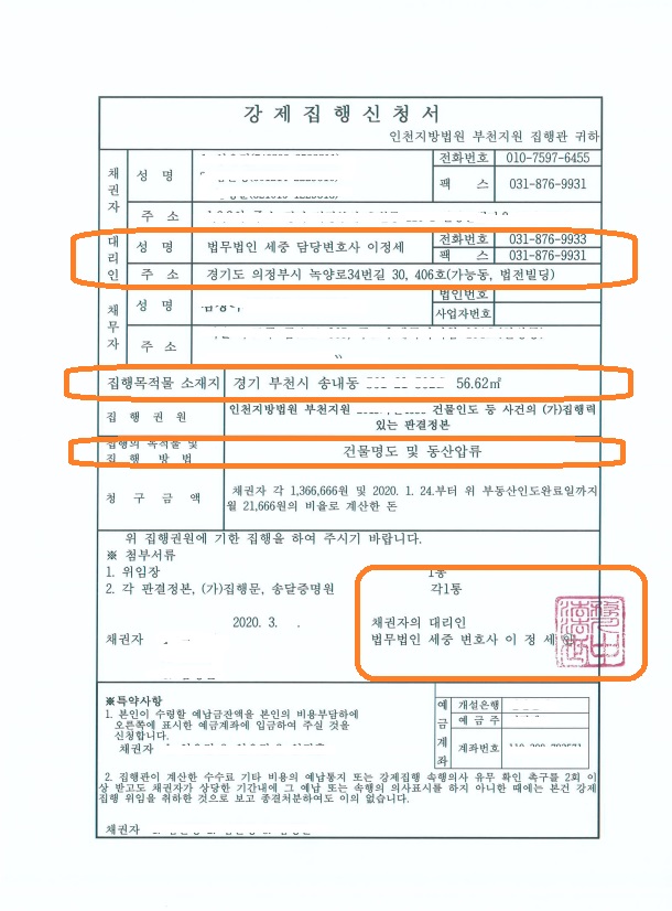 월차임 동산압류 및 인도집행 동시신청서 페이지 정보 작성자 (14.♡.133.23) 작성일20-04-29 17:21 조회3,245회 댓글0건 관련링크 이전글 다음글 목록 본문 임차인이 월차임을 연체하였고, 연체한 차임이 보증금을 모두 소진한 상태에서 임차인에 대한 임료상당의 부당이득금 및 인도집행 판결을 받은 사례임대목적물 내부에 임차인 소유의 동산압류 및 인도집행을 동시에 신청한 사례 댓글목록 등록된 댓글이 없습니다. 이전글 다음글 목록