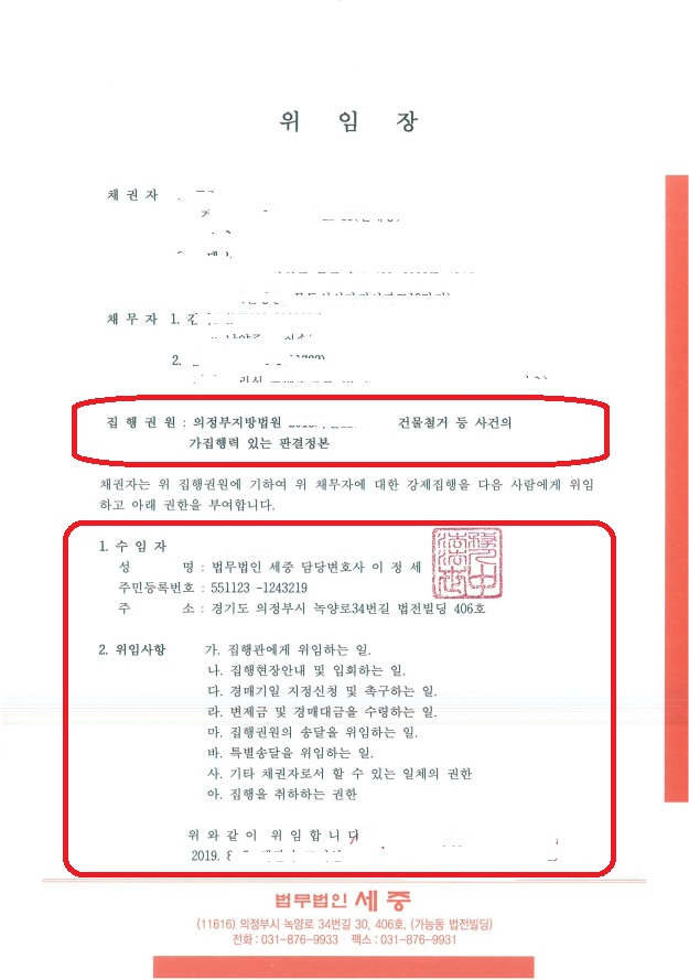 건물철거 인도집행 위임장(대리인 법무법인 세중) 페이지 정보 작성자 (14.♡.133.23) 작성일20-04-29 17:23 조회3,887회 댓글0건 관련링크 이전글 다음글 목록 본문 임대인 스스로 건물철거 및 토지인도 소송을 제기하여 판결을 받은 후본 법무법인에 건물철거 및 토지인도 강제집행 사건을 의뢰한 사례집행신청시 첨부하는 본 법무법인의 강제집행 위임장 댓글목록 등록된 댓글이 없습니다. 이전글 다음글 목록